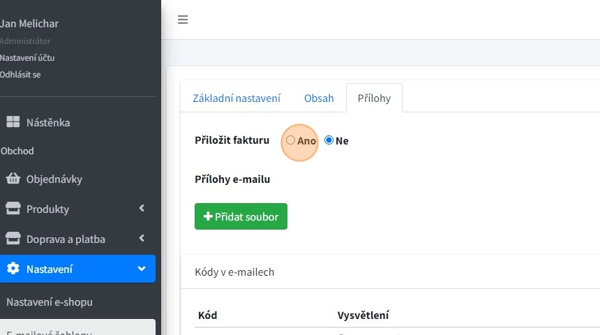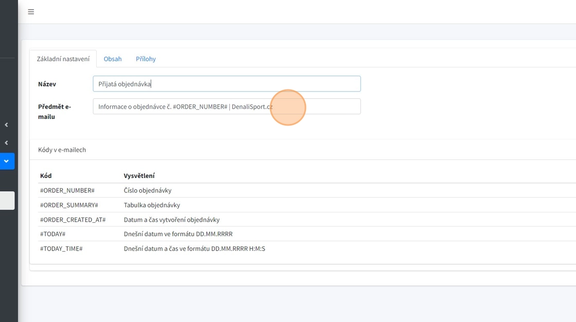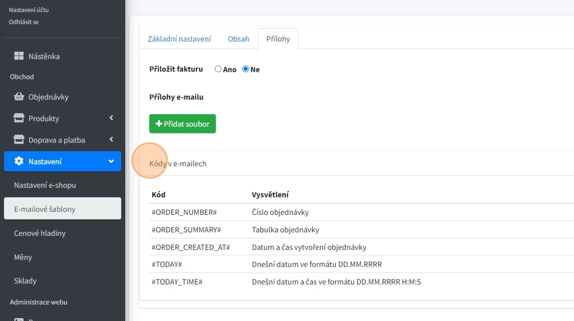 11. "Kódy v e-mailech" - kopírováním daného kódu do obsahu mailu ve tvaru, který je předepsán ve sloupci "kód", lze do těla emailu vkládat proměnné.