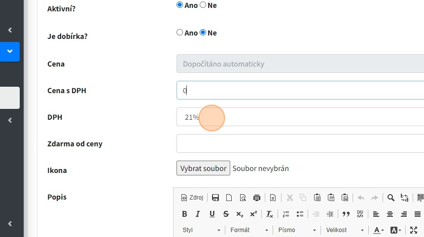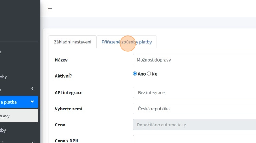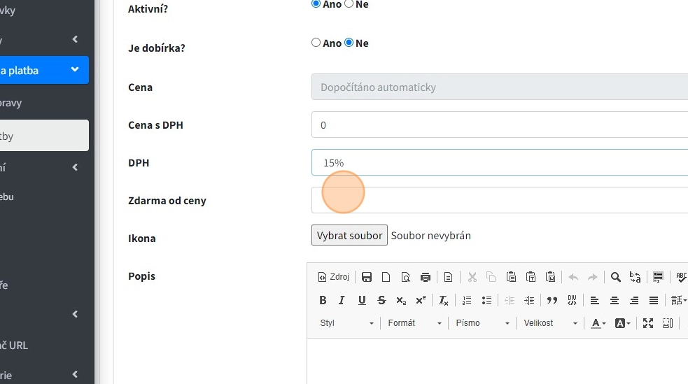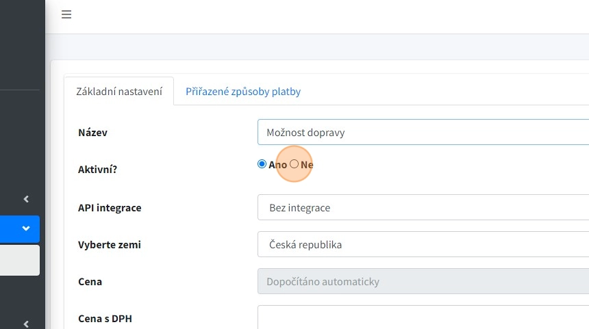 4. Pole "Aktivní?" - po zaškrtnutí určuje, zda může tento způsob dopravy zákazník zvolit při tvorbě objednávky