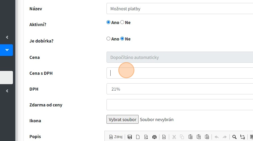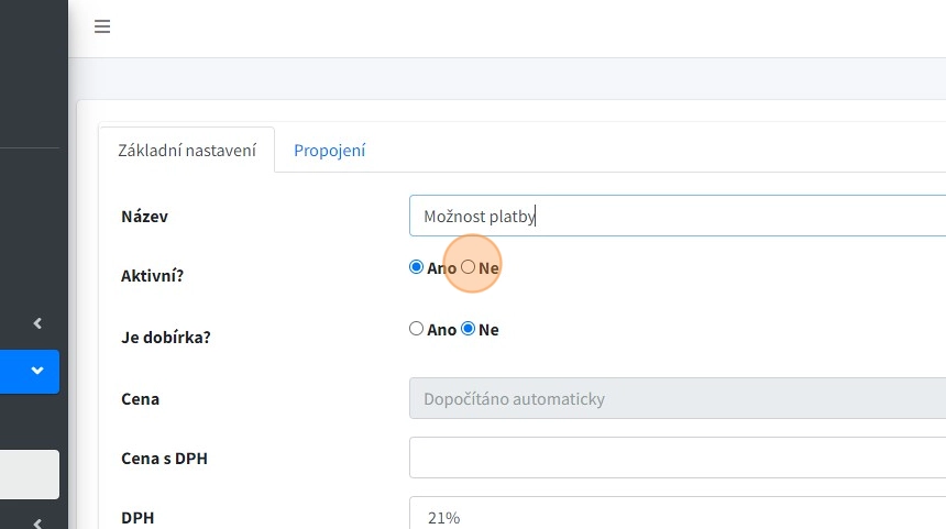 4. Pole "Aktivní?" - po zaškrtnutí určuje, zda může tento způsob platby zákazník zvolit při tvorbě objednávky
