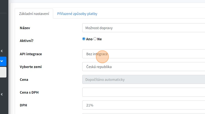 5. "API Integrace" - zvolení integrované API např. zásilkovna