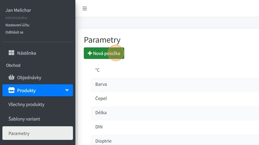 1. Tlačítko "Nová položka" pro vytvoření nového parametru produktu