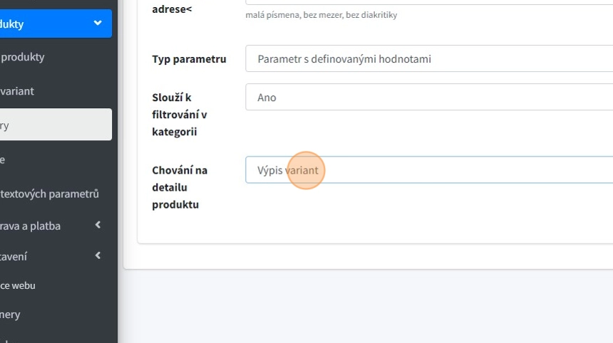 6. "Chování na detailu produktu" - dle zadané hodnoty určuje chování parametru. Jednotlivé možnosti jsou popsány níže.