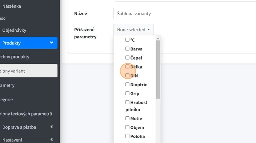 Tip: Vytvořené šablony variant usnadňují práci při vytváření produktu s variantami. Pokud se parametry u některých variant produktů často opakují, lze vytvořit šablonu variant a k ní přiřadit příslušné parametry. Při vytváření varianty produktu poté není nutné dané parametry zdlouhavě dohledávat v seznamu všech vytvořených parametrů.