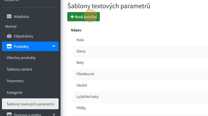 Tip: Šablony textových parametrů, umožnují vytvořit skupinu parametrů a k nim přiřadit textový řetězec. Předvytvořením těchto šablon usnadní práci při tvorbě produktů, kde se tyto parametry často opakují.